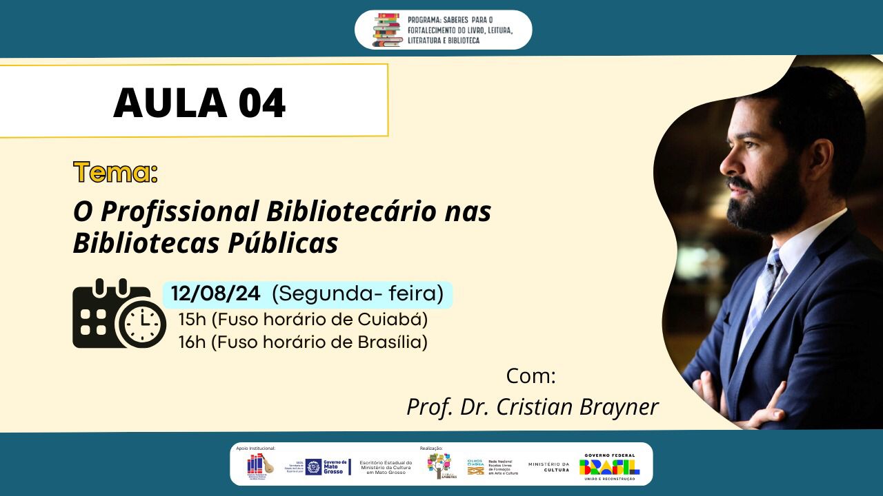 A aula 04 do curso de Gestão de Bibliotecas Públicas e Comunitárias acontece nesta segunda-feira, 12 de agosto, às 15h (horário de Cuiabá) e 16h (Horário de Brasília). A aula será ministrada pelo Prof. Dr. Cristian Brayner, com a temática: "Profissional Bibliotecário nas Bibliotecas Públicas"