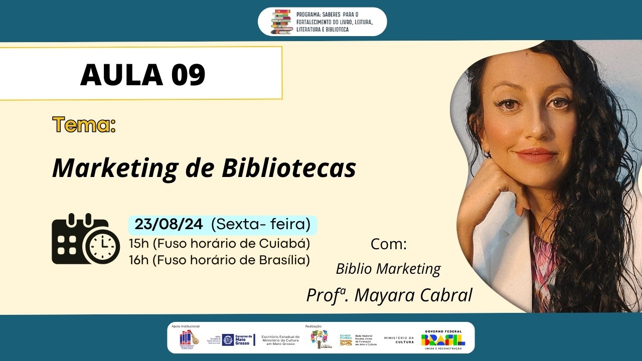 A aula 09 do curso de Gestão de Bibliotecas Públicas e Comunitárias acontece nesta sexta-feira, 23 de agosto, às 15h (horário de Cuiabá) e 16h (Horário de Brasília). A aula será ministrada pela Profa. Mayara Cabral/Biblio Marketing com a temática: MARKETING DE BIBLIOTECAS.