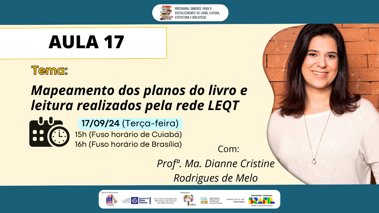 A aula 17 do curso de Gestão de Bibliotecas Públicas e Comunitárias acontece nesta terça-feira, 17 de setembro às 15h (horário de Cuiabá) e 16h (Horário de Brasília). A aula será ministrada pela Profa. Ma. Dianne Cristine Rodrigues de Melo com o tema: MAPEAMENTO DOS PLANOS DO LIVRO E LEITURA REALIZADO PELA REDE LEQTP