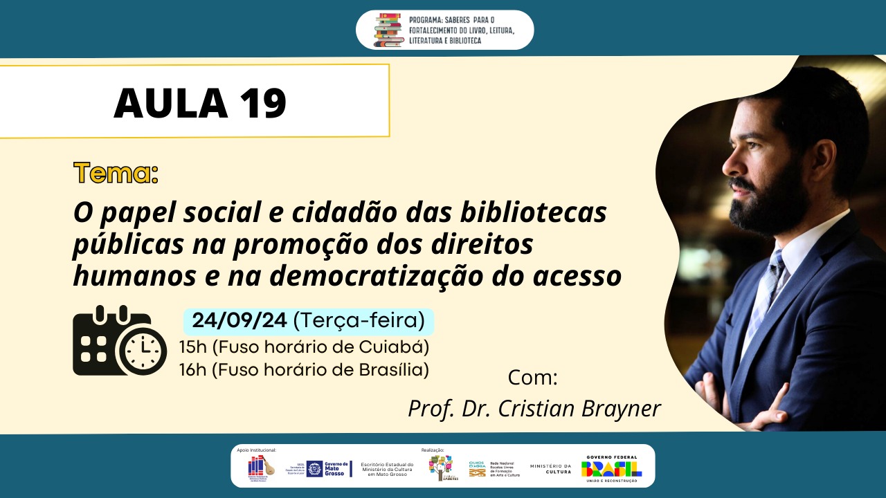 A aula 19 do curso de Gestão de Bibliotecas Públicas e Comunitárias acontece nesta terça-feira, 24 de setembro às 15h (horário de Cuiabá) e 16h (Horário de Brasília). A aula será ministrada pelo Prof. Dr. Cristian Brayner com a temática: O PAPEL SOCIAL E CIDADÃO DAS BIBLIOTECAS PÚBLICAS NA PROMOÇÃO DOS DIREITOS HUMANOS E NA DEMOCRATIZAÇÃO DO ACESSO