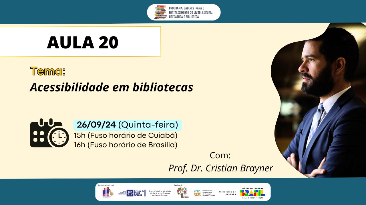 A aula 20 do curso de Gestão de Bibliotecas Públicas e Comunitárias acontece nesta quinta-feira, 26 de setembro às 15h (horário de Cuiabá) e 16h (Horário de Brasília). A aula será ministrada pelo Prof. Dr. Cristian Brayner com a temática: ACESSIBILIDADE EM BIBLIOTECAS