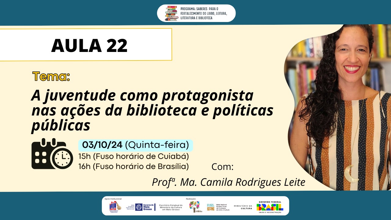 A aula 22 do curso de Gestão de Bibliotecas Públicas e Comunitárias acontece nesta quinta-feira, 03 de outubro às 15h (horário de Cuiabá) e 16h (Horário de Brasília). A aula será ministrada pelo Profa Ma. Camila Rodrigues Leite com a temática: A JUVENTUDE COMO PROTAGONISTA NAS AÇÕES DA BIBLIOTECA E POLÍTICAS PÚBLICAS