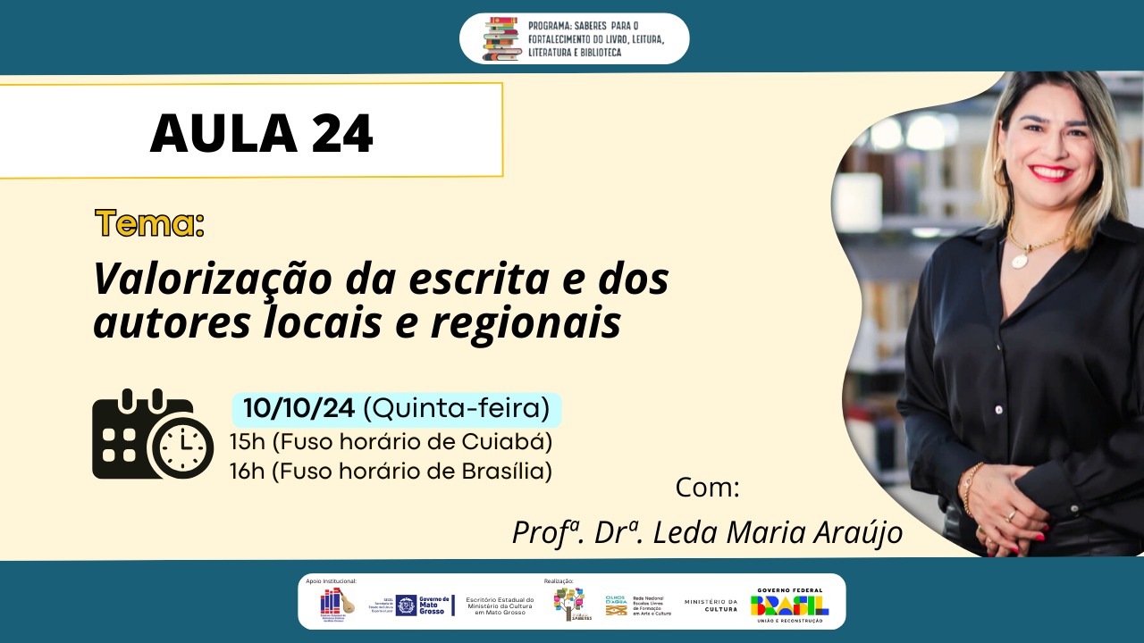 A aula 24 do curso de Gestão de Bibliotecas Públicas e Comunitárias acontece nesta quinta-feira, 10 de outubro às 15h (horário de Cuiabá) e 16h (Horário de Brasília). A aula será ministrada pelo Profa Dra Leda Maria Araújo com a temática: VALORIZAÇÃO DA ESCRITA E DOS AUTORES LOCAIS E REGIONAIS