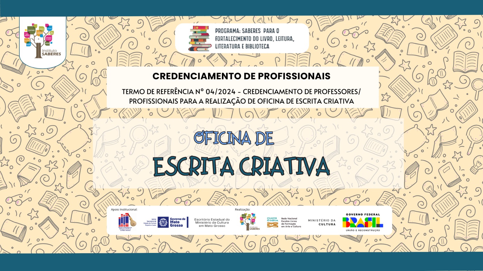 Últimos dias para o credenciamento de pessoas jurídicas (MEI ou ME) e pessoas físicas, residentes no município de Juína, para a execução de Oficina de escrita Criativa do projeto Programa Saberes para o fortalecimento do Livro, Leitura, Literatura e Biblioteca - Termo de Fomento no 950391/2023. As oficinas deverão ser realizadas no município de Juína, com carga horária de 20h, com até 20 beneficiários por oficina.