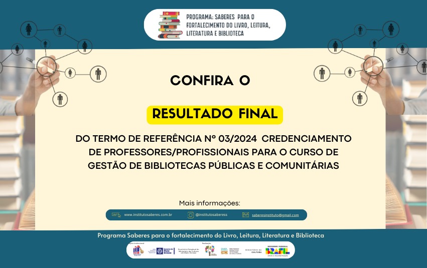 Confira no link de acesso abaixo, o RESULTADO FINAL do Termo de Referência nº 03/2024 - CREDENCIAMENTO DE PROFESSORES/PROFISSIONAIS PARA O CURSO DE GESTÃO DE BIBLIOTECAS PÚBLICAS E COMUNITÁRIA.